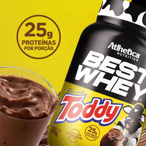 A collab mais aguardada do ano chegou! O Best Whey® sabor achocolatado TODDY® une o prazer do achocolatado que todo mundo conhece e ama à praticidade e a tecnologia de um suplemento completo. Com 25g de proteína por porção, ele é perfeito para turbinar seu dia a dia, seja no pré e pós-treino ou para dar um toque especial nas receitas. Sabor delicioso, nutrição de qualidade e versatilidade em um só suplemento.